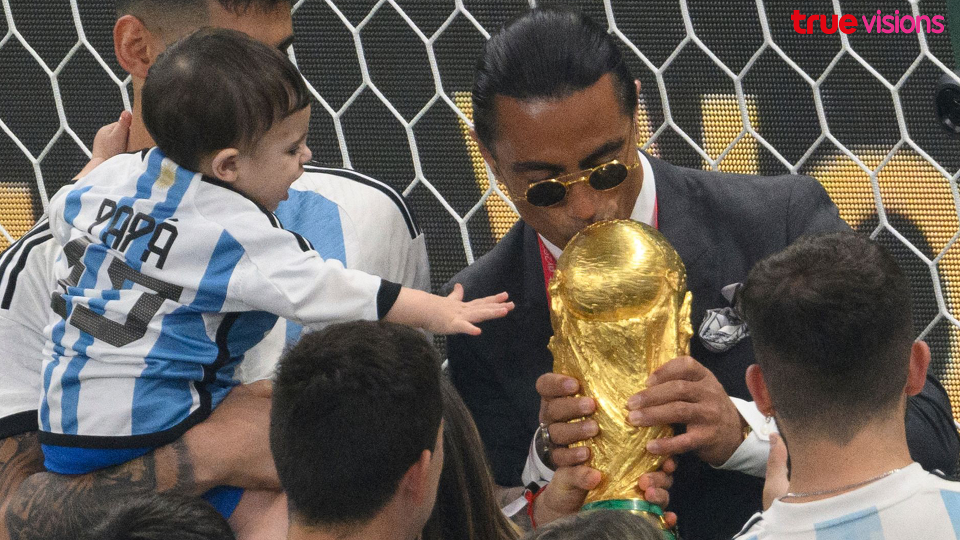 ซอลท์ เบย์ ไปถือถ้วยแชมป์ฟุตบอลโลก แล้วก็ยังพยายามจะถ่ายรูปกับนักเตะซูเปอร์สตาร์อย่าง ลิโอเนล เมสซี่ และ อังเคล ดิ มาเรีย