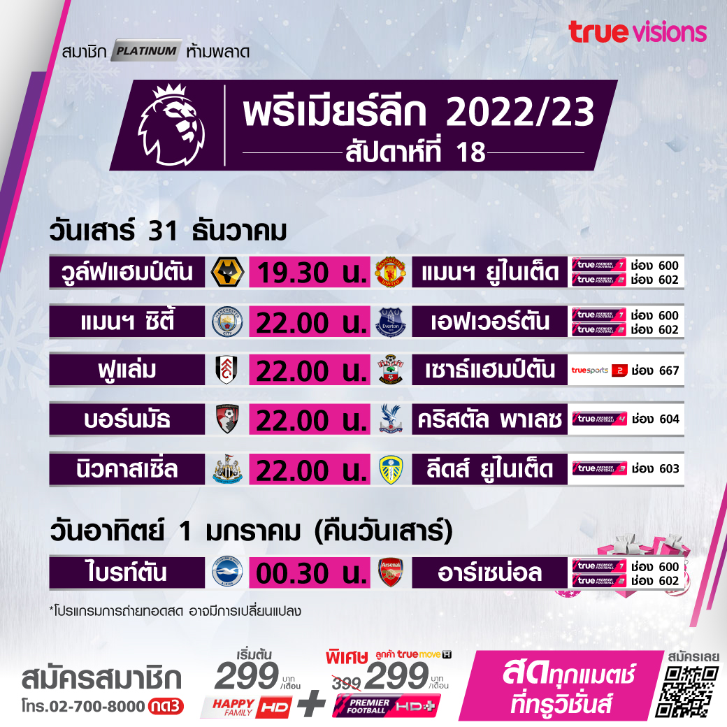 วันนี้มีอะไรดูที่ ทรูวิชั่นส์ ประจำวันเสาร์ที่ 31 ธันวาคม 65 ไฮไลท์ยังอยู่ที่ศึกพรีเมียร์ลีก อังกฤษ ที่ยังคงลงเตะในช่วงสิ้นปีอย่างต่อเนื่อง นอกจากนี้ยังมีศึก ลา ลีกา สเปน ให้ได้ตามเชียร์กันอีกเพียบ รวมถึงศึกบาสเกตบอล เอ็นบีเอ ฤดูกาล 2022/23 งานนี้ ทรูวิชั่นส์ จัดเต็มให้ชมกันถึงบ้าน