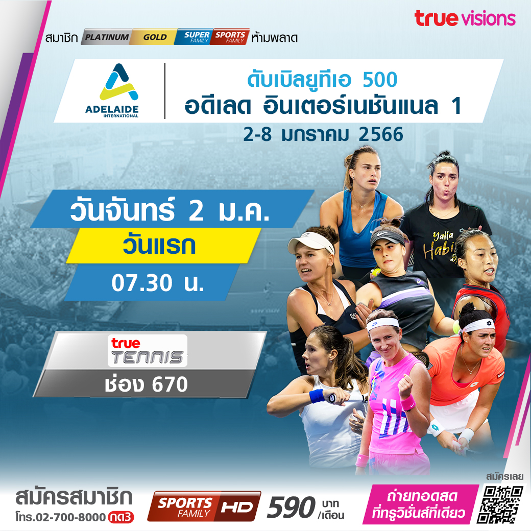 เทนนิสหญิงรายการสำคัญระดับ 500 ซีรี่ส์ รายการแรก ของปี 2023 ดับเบิลยูทีเอ 500 อดีเลด อินเตอร์ชั่นแนล 1 นักเทนนิสชั้นนำของโลก ร่วมลุ้นแชมป์กันคับคั่งที่เมือง อดีเลด ประเทศออสเตรเลีย ชมสด รอบแรก ถึงรอบชิงชนะเลิศ ชมสด ทางทรูวิชั่นส์ ที่เดียว