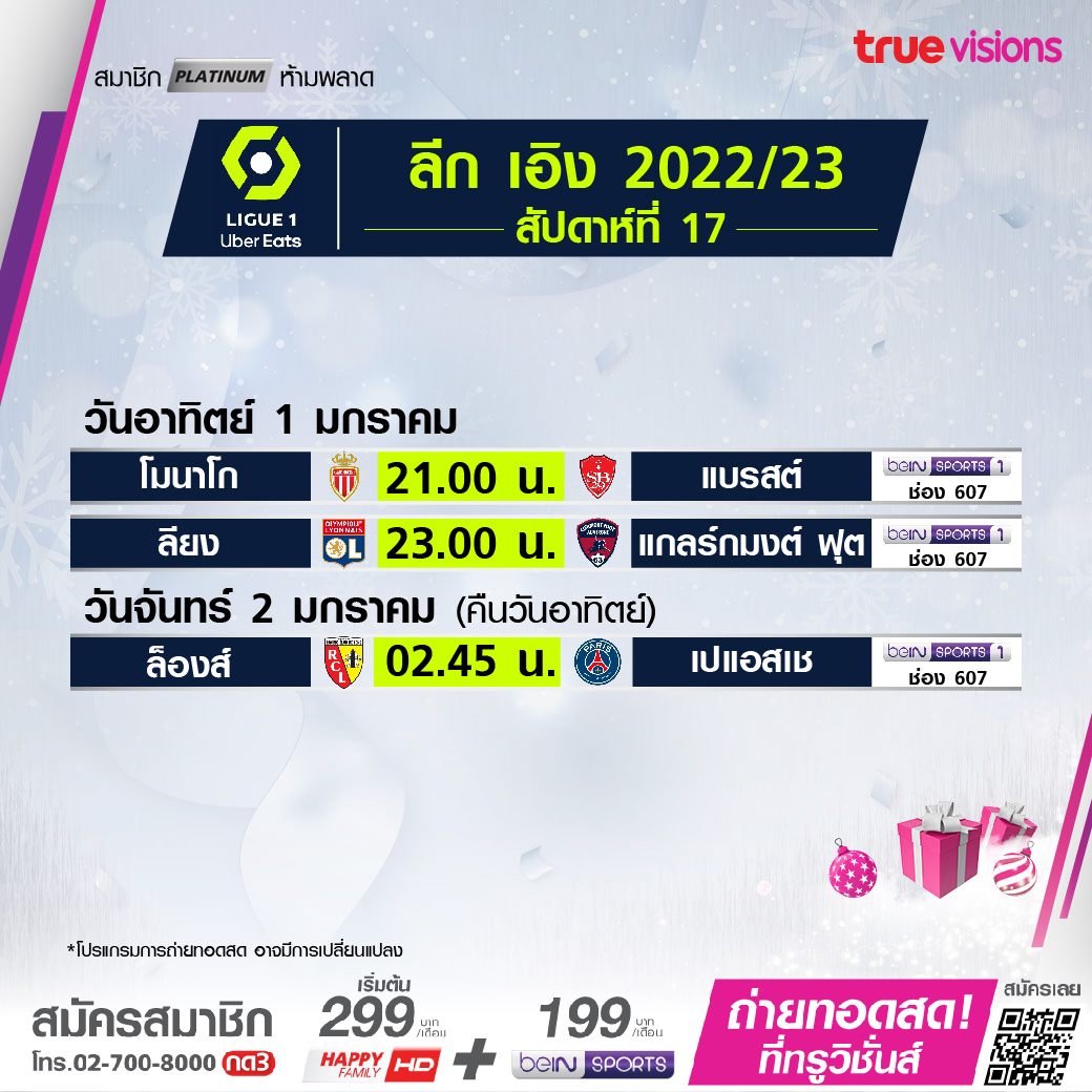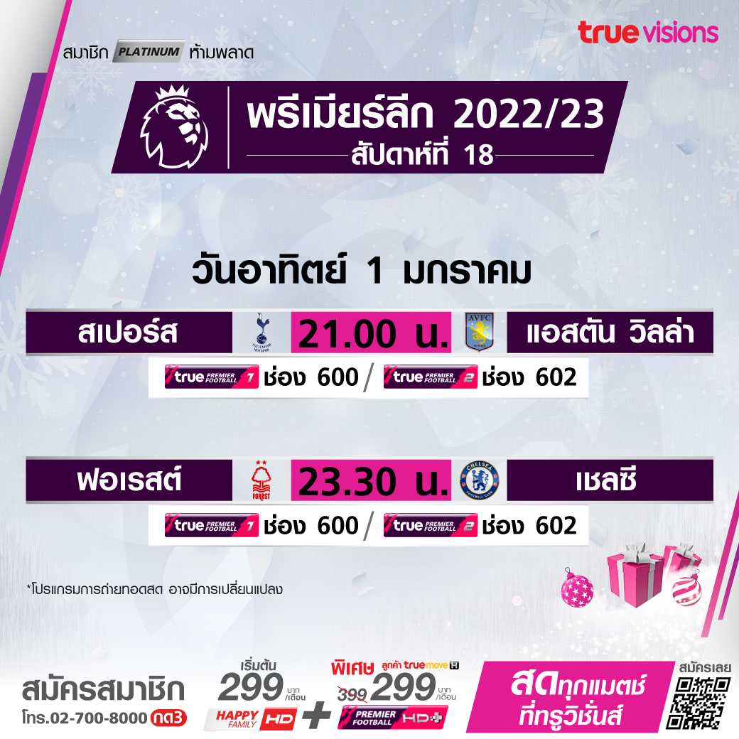 วันนี้มีอะไรดูที่ ทรูวิชั่นส์ ประจำวันขึ้นปีใหม่ อาทิตย์ที่ 1 มกราคม 66 ไฮไลท์ยังอยู่ที่ศึกพรีเมียร์ลีก อังกฤษ ที่ยังคงลงเตะในช่วงวันสิ้นปีต่อเนื่องจนถึงปีใหม่ โดยวันนี้ยังมีให้ได้ตามลุ้นกันอีก 2 คู่ นอกจากนี้ยังมีศึก ลีก เอิง ฝรั่งเศส ให้ได้ตามเชียร์กันอย่างต่อเนื่อง รวมถึงกีฬาอื่นๆ อย่างเทนนิสหญิง ดับเบิ้ลยูทีเอ ทัวร์ รายการ อดีเลด อินเตอร์เนชั่นแนล 1, ศึกบาสเกตบอล เอ็นบีเอ และ อเมริกันฟุตบอล เอ็นเอฟแอล ฤดูกาล 2022/23 งานนี้ ทรูวิชั่นส์ จัดเต็มให้ชมกันถึงบ้าน