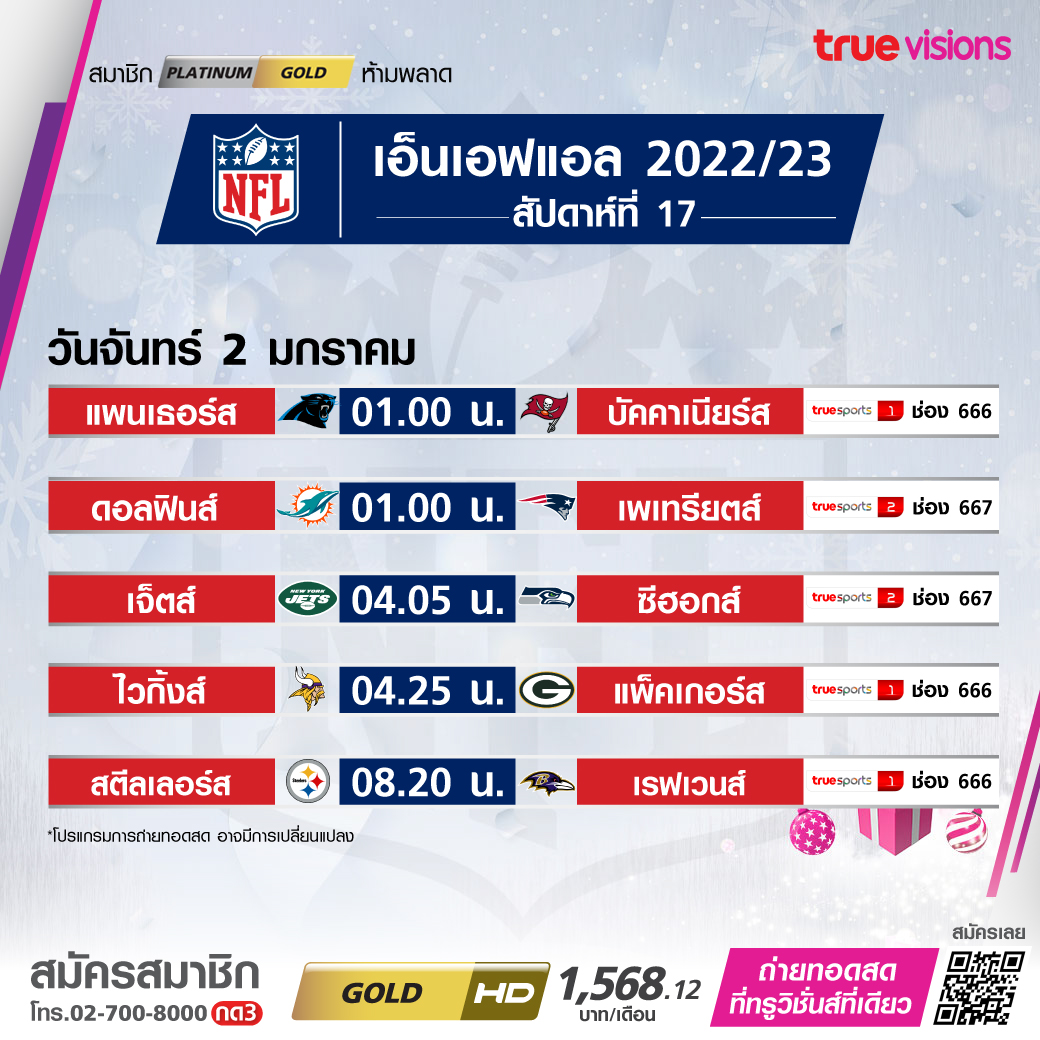วันจันทร์ 2 Panthers Vs Buccaneers เวลา 01.00 ทางช่อง TS 1 (666)
