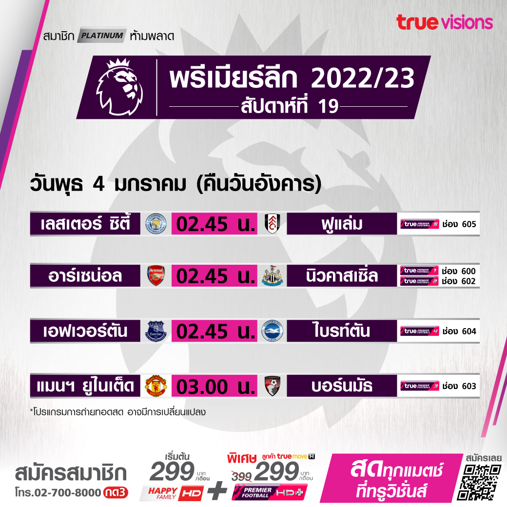 วันนี้มีอะไรดูที่ ทรูวิชั่นส์ ประจำวันอังคารที่ 3 มกราคม 66 ไฮไลท์ยังอยู่ที่ศึกพรีเมียร์ลีก อังกฤษ ที่ยังคงลงเตะกันอย่างต่อเนื่อง ขณะที่กีฬาอื่นๆ ยังมีเทนนิสหญิง ดับเบิ้ลยูทีเอ ทัวร์ รายการ อดีเลด อินเตอร์เนชั่นแนล 1 และศึกบาสเกตบอล เอ็นบีเอ ฤดูกาล 2022/23 งานนี้ ทรูวิชั่นส์ จัดเต็มให้ชมกันถึงบ้าน