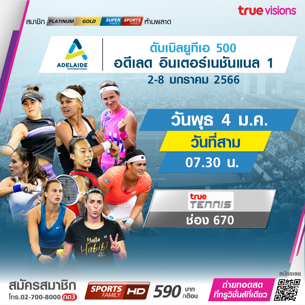 เทนนิสหญิงรายการสำคัญระดับ 500 ซีรี่ส์ รายการแรก ของปี 2023 ดับเบิลยูทีเอ 500 อดีเลด อินเตอร์ชั่นแนล 1 นักเทนนิสชั้นนำของโลก ร่วมลุ้นแชมป์กันคับคั่งที่เมือง อดีเลด ประเทศออสเตรเลีย ชมสดการแข่งขันในวันที่สาม ทางทรูวิชั่นส์ ที่เดียว