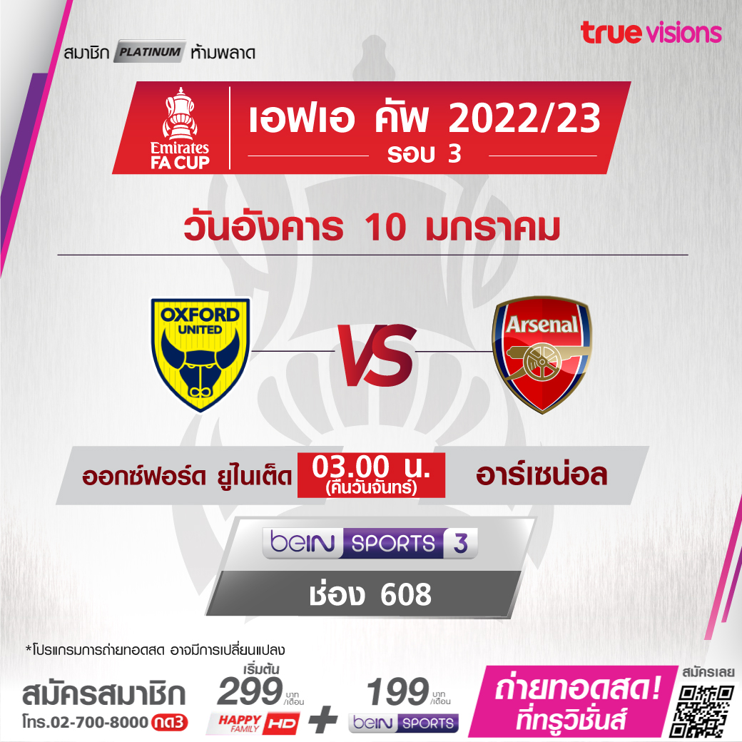 Oxford Utd vs Arsenal เวลา 03.00-05.00 ทางช่อง beIN 3 (608)