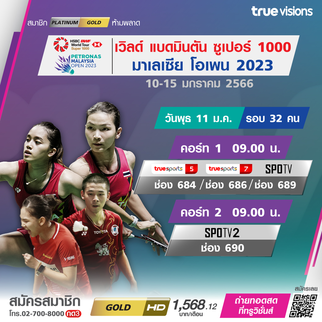 แบดมินตัน มาเลเซีย โอเพ่น รายการใหญ่ระดับเวิลด์ ทัวร์ ซูเปอร์ 1000 รอบ 32 คนสุดท้ายในวันที่สอง ร่วมเชียร์นักแบดมินตันไทยสู้เพื่อคว้าชัยชนะกับคู่แข่งระดับโลกมากมาย ชมสดครบ ทุกรอบ ชมสด ทางทรูวิชั่นส์ ที่เดียว