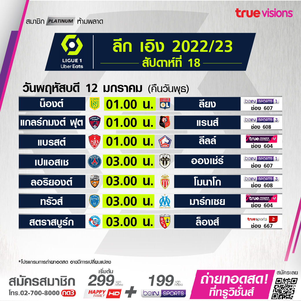 วันนี้มีอะไรดูที่ ทรูวิชั่นส์ ประจำวันพุธที่ 11 มกราคม 66 สำหรับฟุตบอลยังมีศึก ลีก เอิง ฝรั่งเศส ให้ได้ตามเชียร์กันอย่างต่อเนื่อง ส่วนกีฬาอื่นๆ ยังมีศึกสอยคิวรายการใหญ่ เวิลด์ สนุกเกอร์ กาซู มาสเตอร์ส 2023, แบดมินตันรายการซูเปอร์ 1000 บีดับเบิ้ลยูเอฟ มาเลเซีย โอเพ่น, เทนนิสหญิงดับเบิ้ลยูทีเอทัวร์ รายการ โฮบาร์ท อินเตอร์เนชั่นแนล รวมถึงยังมีศึกบาสเกตบอล เอ็นบีเอ ฤดูกาล 2022/23 งานนี้ ทรูวิชั่นส์ จัดเต็มให้ชมกันถึงบ้าน
