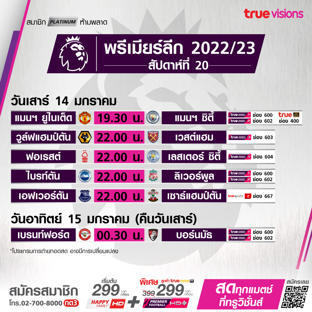 Man Utd vs Man City เวลา 19:30 - 21:30 ทางช่อง TPF 1(600) / TPF 2 (602) / True 4K (400)
