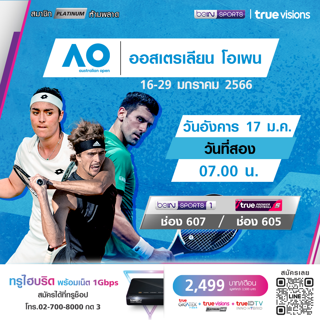 ศึกเทนนิสแกรนด์สแลมแรกของปี 2023 ออสเตรเลี่ยน โอเพ่น กลับมาท้าทายความสามารถของบรรดานักหวดอีกครั้ง บนฮาร์ดคอร์ตใน เมลเบิร์น พาร์ค ร่วมเชียร์นักเทนนิสระดับโลก ชมสดในรอบเมนดรอว์ตั้งแต่รอบแรกจนถึงรอบชิงชนะเลิศ ที่ทรูวิชั่นส์