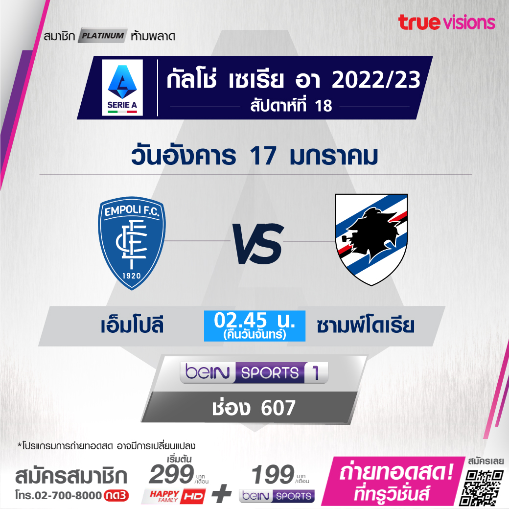 Empoli vs Sampdoria เวลา 02.45-04.45 ทางช่อง beIN 1 (607)