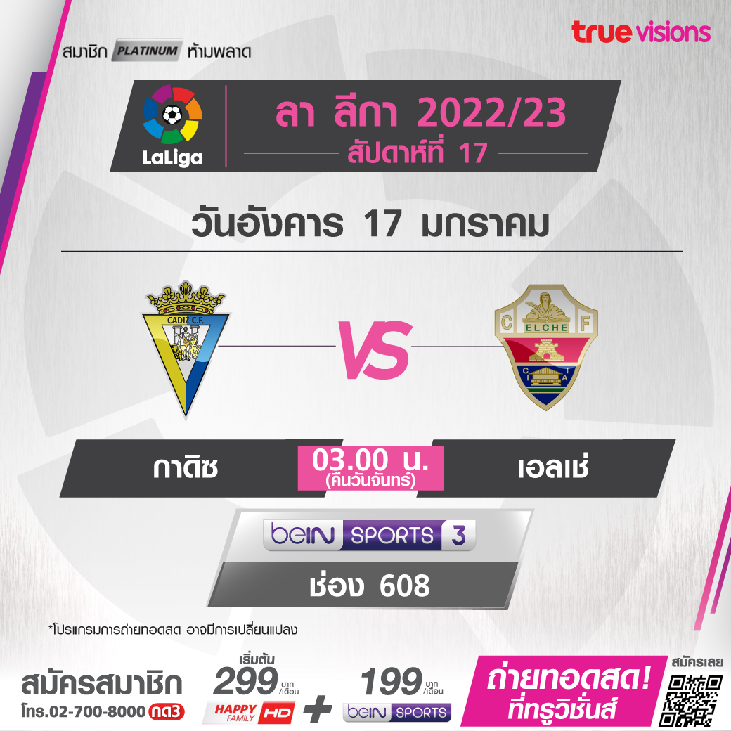 Cadiz vs Elche เวลา 03.00-05.00 ทางช่อง beIN 3 (608)