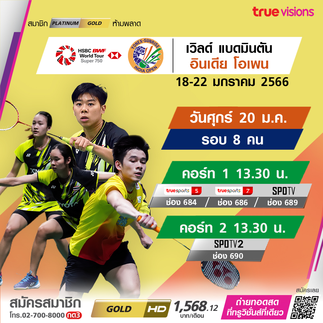 แบดมินตันรายการระดับ เวิลด์ ทัวร์ ซูเปอร์ 750 อินเดีย โอเพ่น มาถึงในรอบ 8 คนสุดท้าย ลุ้นนักแบดมินตันไทยคว้าแชมป์ในรายการนี้ ชมสด ทาง ทรูวิชั่นส์ ที่เดียว