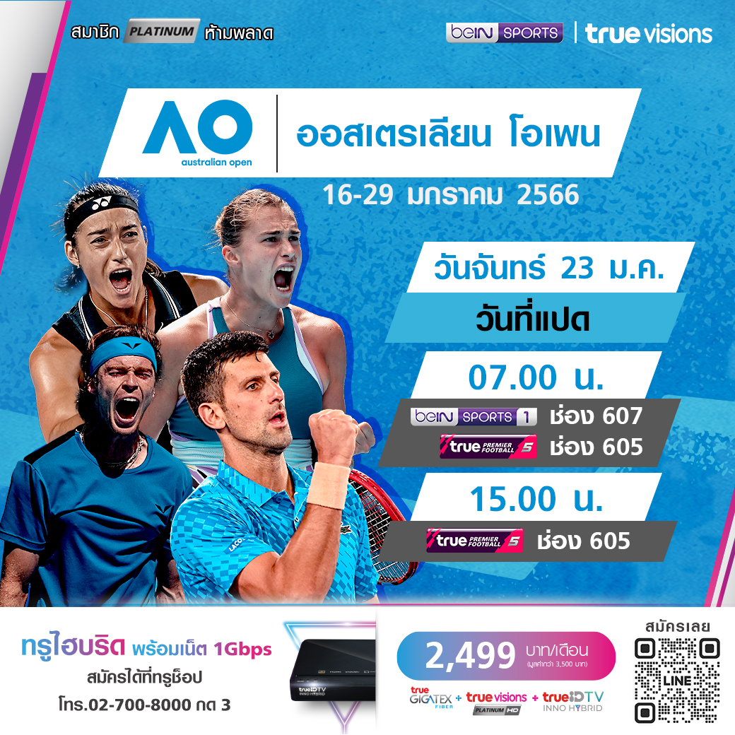 ศึกเทนนิสแกรนด์สแลมแรกของปี 2023 ออสเตรเลี่ยน โอเพ่น เข้าสู่การแข่งขันในวันที่แปด ร่วมเชียร์นักเทนนิสระดับโลกคว้าแชมป์แกรนด์สแลมแรกของปี ชมสดในรอบเมนดรอว์ตั้งแต่รอบแรกจนถึงรอบชิงชนะเลิศ ที่ทรูวิชั่นส์