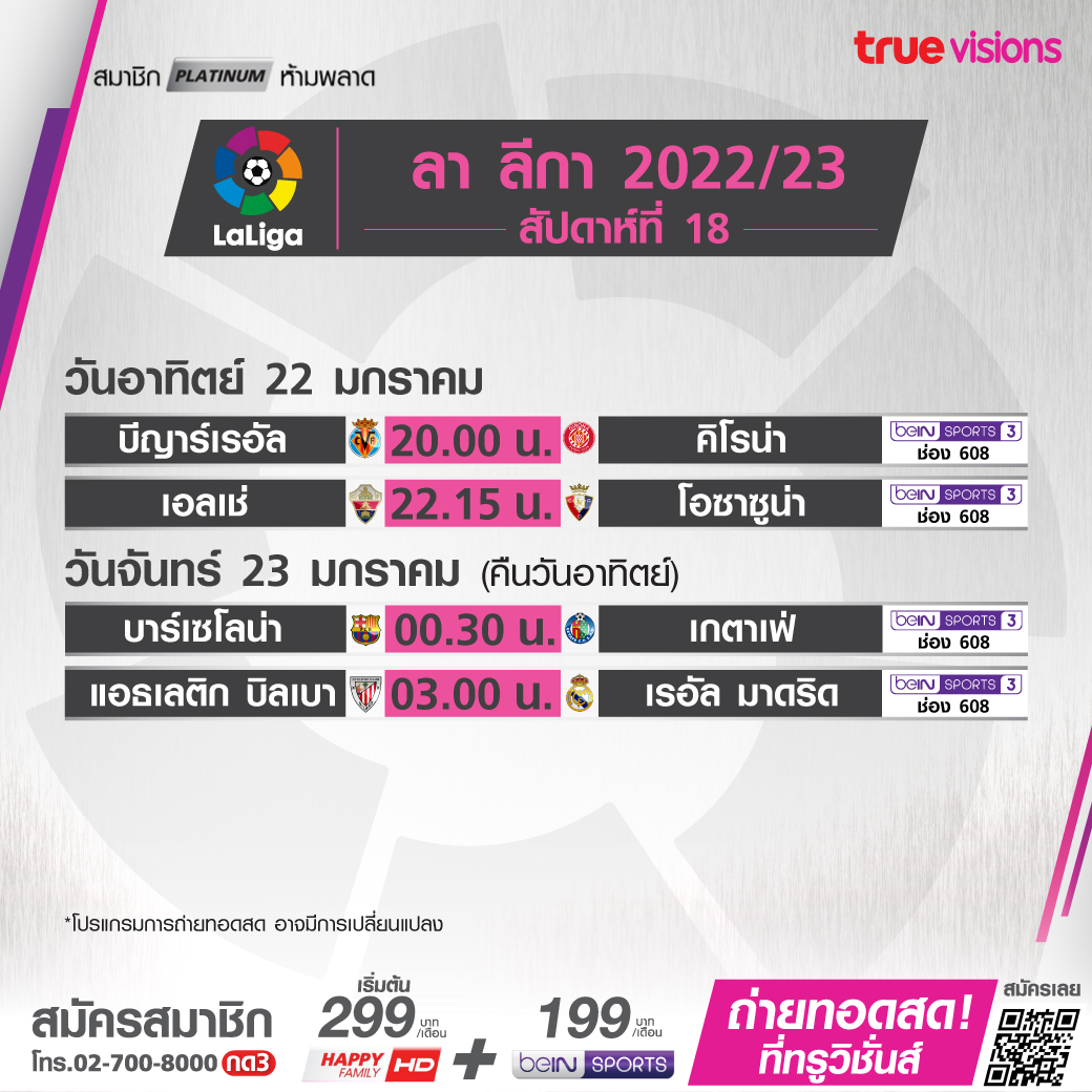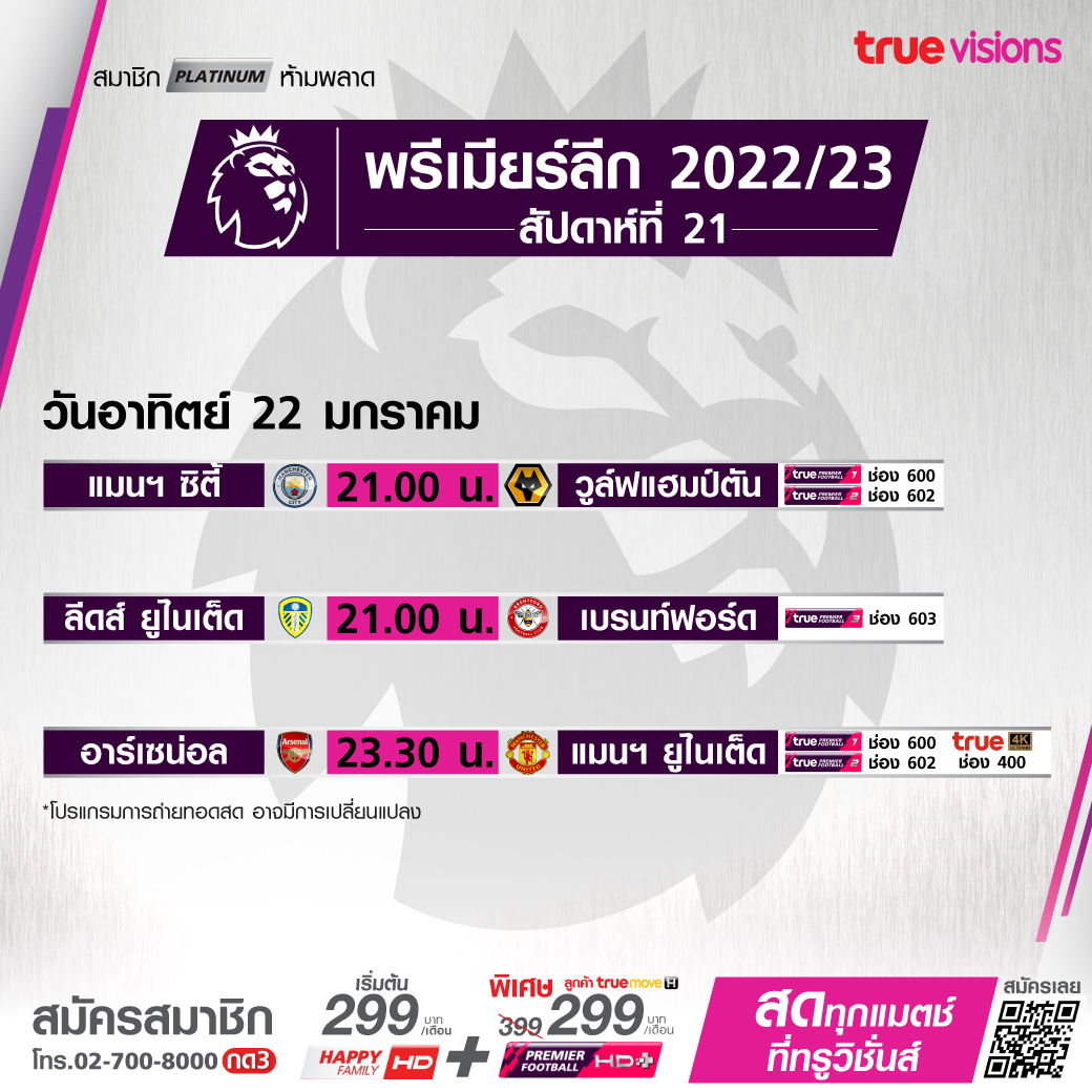 วันนี้มีอะไรดูที่ ทรูวิชั่นส์ ประจำวันอาทิตย์ที่ 22 มกราคม 66 สำหรับฟุตบอลยังมีศึกพรีเมียร์ลีก อังกฤษ, กัลโช่ เซเรีย อา อิตาลี และ ลา ลีกา สเปน ให้ได้เชียร์กันต่อเนื่อง ส่วนกีฬาอื่นๆ ยังมีศึกเทนนิส ออสเตรเลี่ยน โอเพ่น แกรนด์สแลมแรกของปี, ศึกสอยคิวรายการใหญ่ เวิลด์ สนุกเกอร์ เวิลด์ กรังด์ปรีซ์ 2023, แบดมินตัน บีดับเบิ้ลยูเอฟ อินเดีย โอเพ่น, กอล์ฟพีจีเอ ทัวร์ รายการ ดิ อเมริกัน เอ็กซ์เพรสส์, กอล์ฟหญิงแอลพีจีเอ ทัวร์ ทัวร์นาเมนท์ ออฟ แชมเปี้ยนส์, ศึกอเมริกันฟุตบอลเอ็นเอฟแอล และบาสเกตบอล เอ็นบีเอ งานนี้ ทรูวิชั่นส์ จัดเต็มให้ชมกันถึงบ้าน