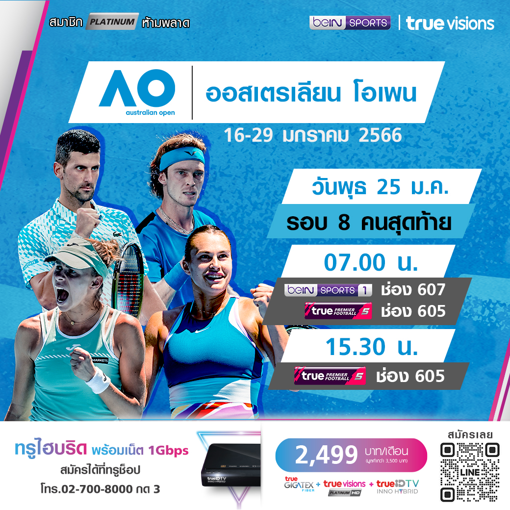 ศึกเทนนิสแกรนด์สแลมแรกของปี 2023 ออสเตรเลี่ยน โอเพ่น เดินทางมาถึงรอบ 8 คนสุดท้ายแล้ว ใครจะผ่านเข้ารอบต่อไปได้และคว้าแชมป์ แกรนด์สแลมแรกของปีไปครองได้ ชมสดในรอบเมนดรอว์ตั้งแต่รอบแรกจนถึงรอบชิงชนะเลิศ ที่ทรูวิชั่นส์