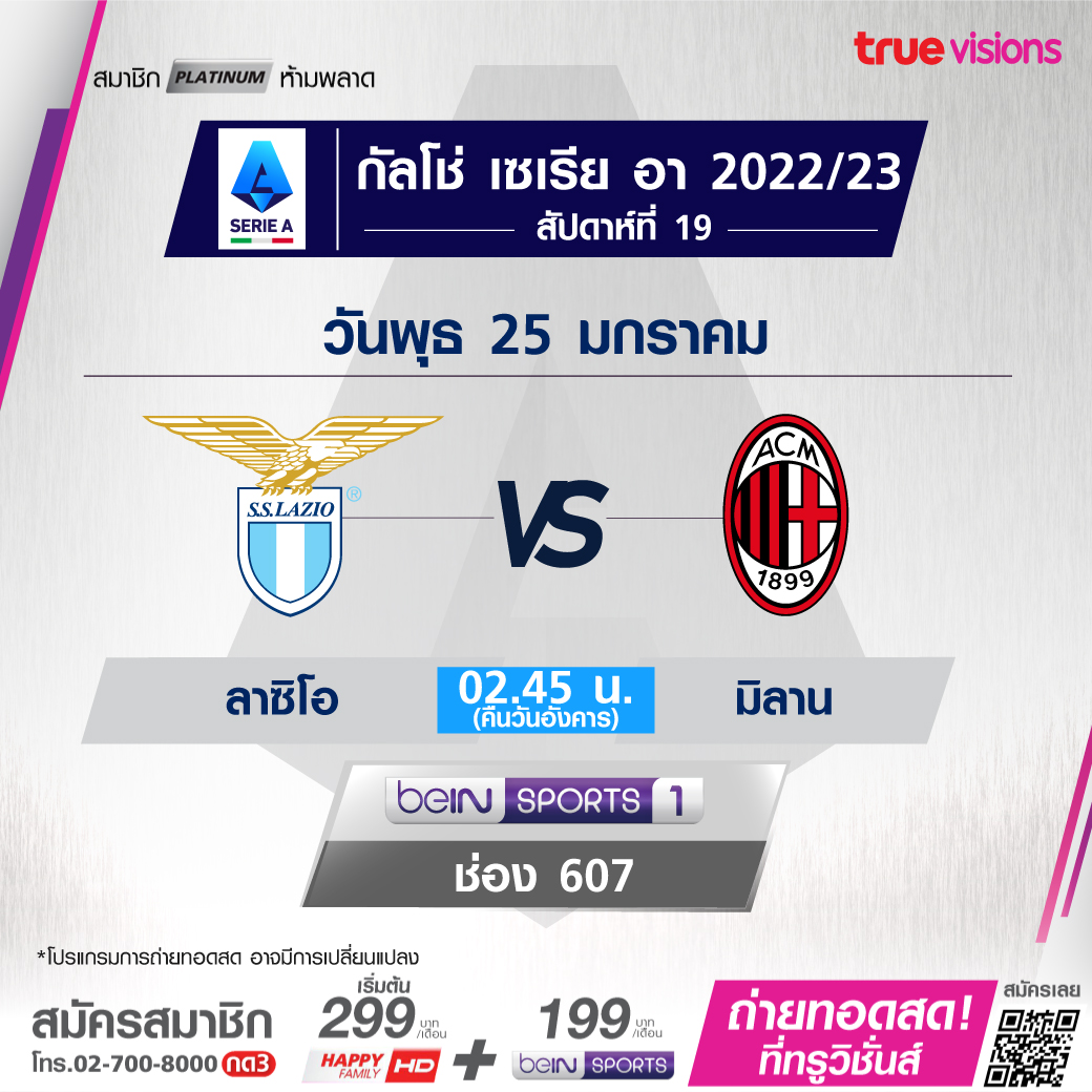 Lazio vs Milan เวลา 02.45-04.45 ทางช่อง beIN 1 (607)