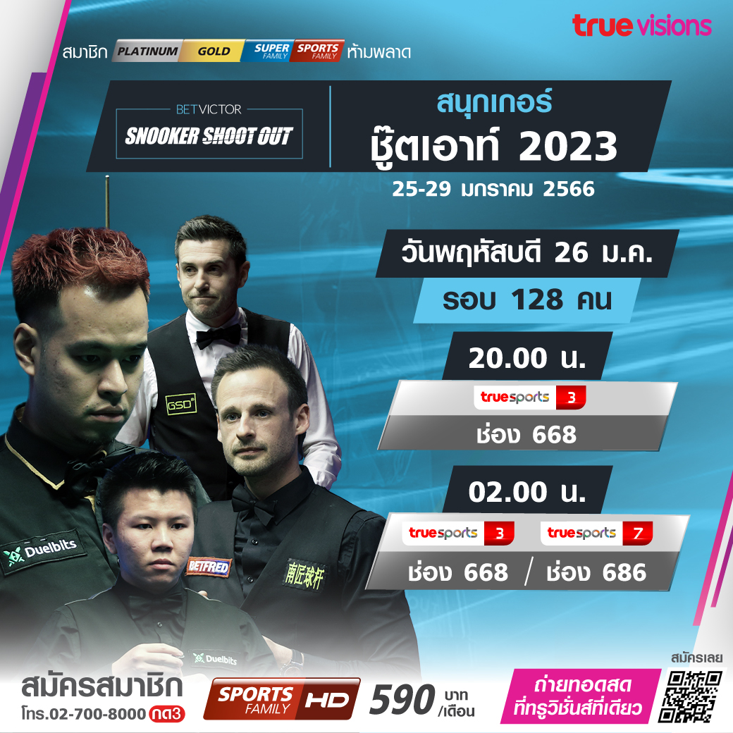 ห้ามพลาดจริงๆ สำหรับแฟนกีฬาสนุกเกอร์ สัปดาห์นี้ เปลี่ยนบรรยากาศมาสู่ความสนุกตื่นเต้นและเร้าใจ กับศึกชู้ตเอาท์ เกมวัดใจ เฟรมเดียว น็อกเอาท์ ตัดสินกันใน 10 นาที อะไรก็เกิดขึ้นได้ มือดีๆ ของโลกร่วมดวลกันอย่างคับคั่ง ชมสดจุใจ ชมสด ทาง ทรูวิชั่นส์ ที่เดียว