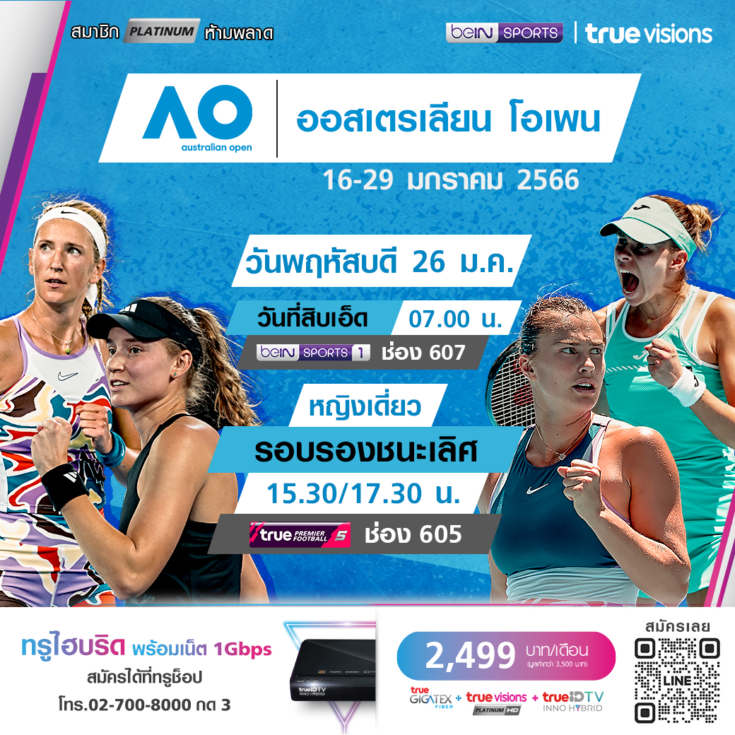 วันนี้มีอะไรดูที่ ทรูวิชั่นส์ ประจำวันพฤหัสบดีที่ 26 มกราคม 66 ไฮไลท์อยู่ที่ศึกเทนนิส ออสเตรเลียน โอเพ่น แกรนด์สแลมแรกของปี ที่เดินทางมาถึงในรอบรอบชนะเลิศ นอกจากนี้ยังมีศึกกอล์ฟ พีจีเอ ทัวร์ รายการ ฟาร์มเมอร์ส อินชัวรันส์, ศึกสอยคิว เวิลด์ สนุกเกอร์ ชู้ตเอาท์ และศึกแบดมินตัน บีดับเบิ้ลยูเอฟ รายการ อินโดนีเซีย มาสเตอร์ส งานนี้ ทรูวิชั่นส์ จัดเต็มให้ชมกันถึงบ้าน