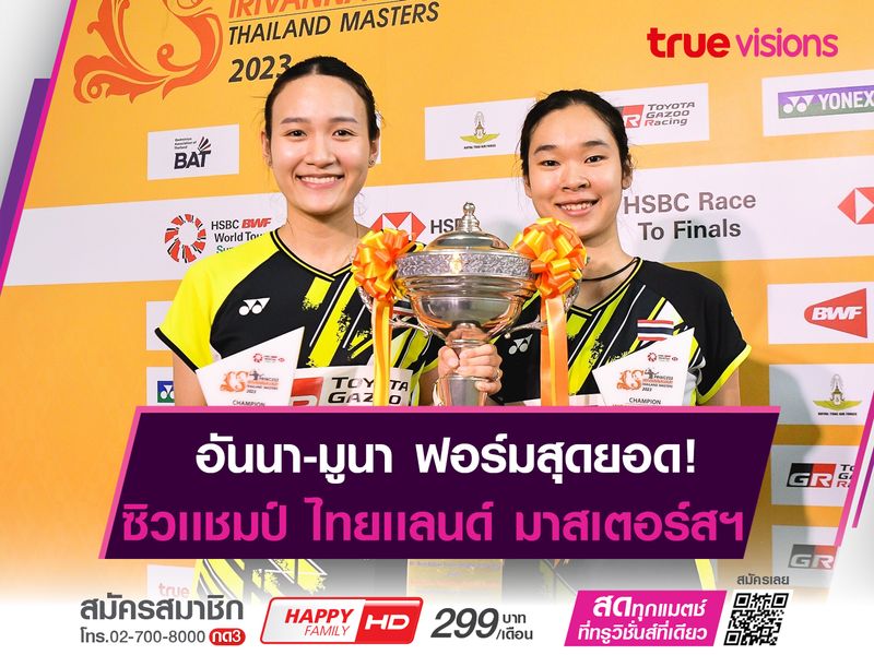 "อันนา" นันทน์กาญจน์ กับ "มูนา" เบญญาภา คว้าแชมป์ประเภทหญิงคู่ แบดมินตัน"ปริ้นเซส สิริวัณณวรี ไทยแลนด์ มาสเตอร์ส 2023" พร้อมครองถ้วยพระราชทานสมเด็จพระเจ้าลูกเธอ เจ้าฟ้าสิริวัณณวรี นารีรัตนราชกัญญา รับเงินรางวัล 16,590 เหรียญสหรัฐ หรือประมาณ 547,000 บาท ส่วนรองแชมป์ เบ็ค ฮานา กับ ลี โซฮี รับเงินรางวัล 7,980 เหรียญสหรัฐ หรือประมาณ 263,340 บาท
