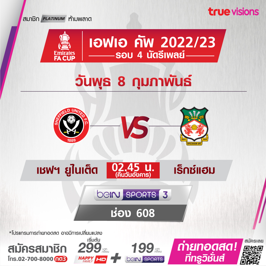 Sheff Utd vs Wrexham เวลา 02.45-04.45 ทางช่อง beIN 3 (608)