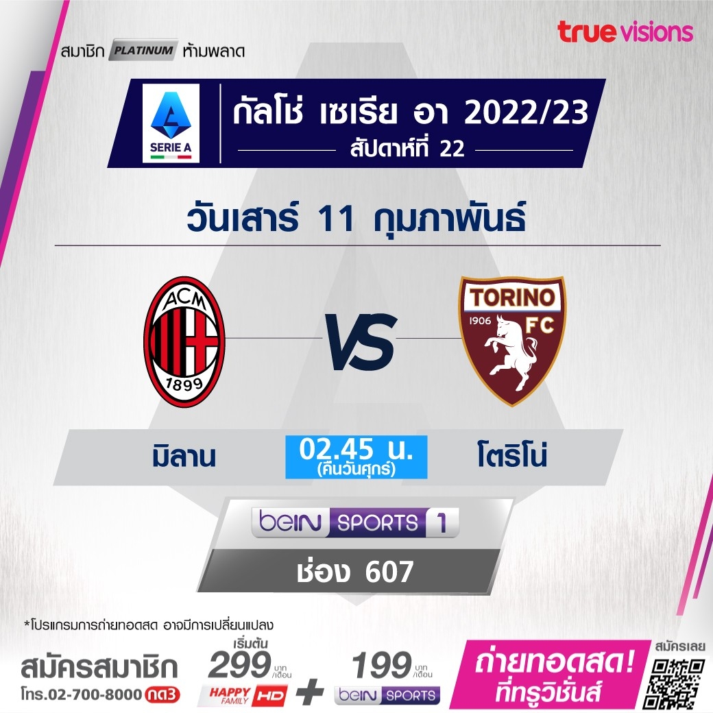 Milan vs Torino เวลา 02.45-04.45 ทางช่อง beIN 1 (607)