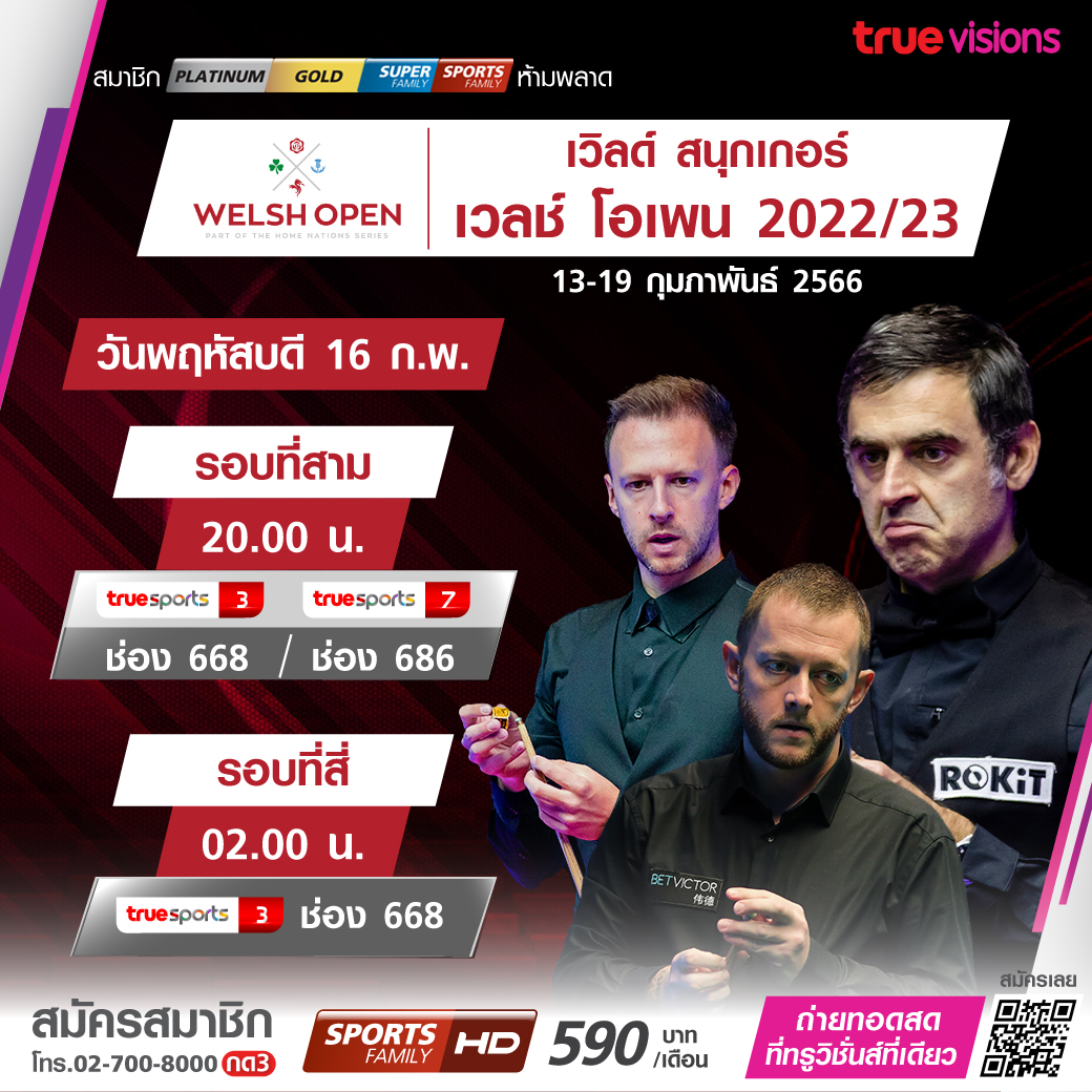 ความสนุกตื่นเต้นและเกมที่เร้าใจของ เวิลด์ สนุกเกอร์ เก็บคะแนนสะสมโลกในครึ่งฤดูกาลหลัง ที่แฟนๆ ต้องไม่พลาดในสัปดาห์นี้ กับรายการ เวลช์ โอเพ่น รายการสุดท้ายของ โฮม เนชั่นส์ ซีรี่ส์ นักสอยคิวขวัญใจแฟนๆ มาดวลกันครบ ชมสดตั้งแต่รอบแรกถึงรอบชิงชนะเลิศ