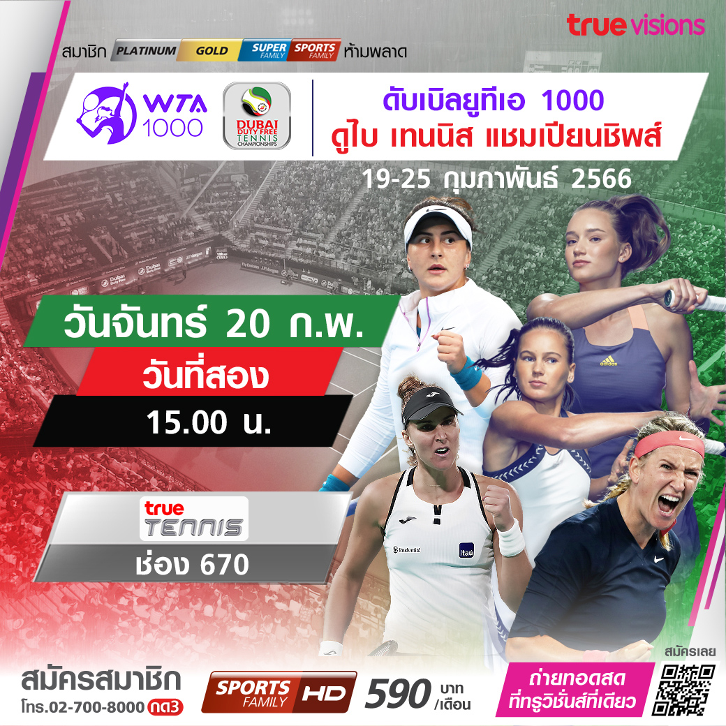 เทนนิสหญิงรายการใหญ่ระดับ 1000 ซีรีส์ ดูไบ เทนนิส แชมเปี้ยนชิพ ในวันที่สอง มือดีของโลกมารวมตัวกันคับคั่ง เพื่อร่วมแข่งขันและลุ้นทำผลงานเพื่อตำแหน่งชนะเลิศ ชมสด ครบทุกรอบ ชมสด ทาง ทรูวิชั่นส์ ที่เดียว