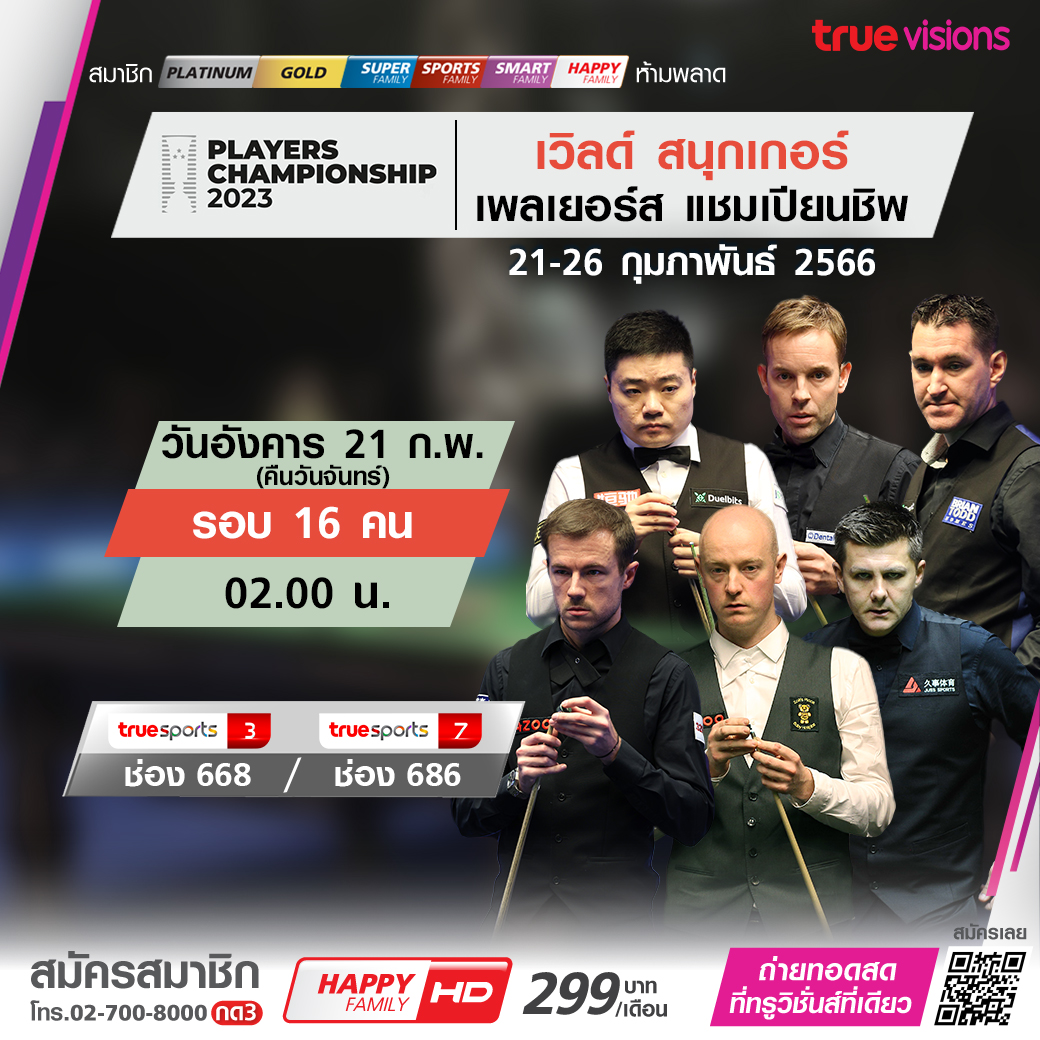 เข้มข้น เร้าใจ เข้าไปทุกขณะ สำหรับสนุกเกอร์เก็บคะแนนสะสมโลกช่วงครึ่งฤดูกาลหลัง ที่ทุกคนต้องเร่งทำผลงานกันเต็มที่ สัปดาห์นี้เป็นคิวของ เพลย์เยอร์ส แชมเปี้ยนชิพ ที่คัดเฉพาะ 16 อันดับแรกของมือพระกาฬมาชิงแชมป์กันที่ประเทศอังกฤษ ชมสดครบทุกรอบ ชมสด ทาง ทรูวิชั่นส์ ที่เดียว