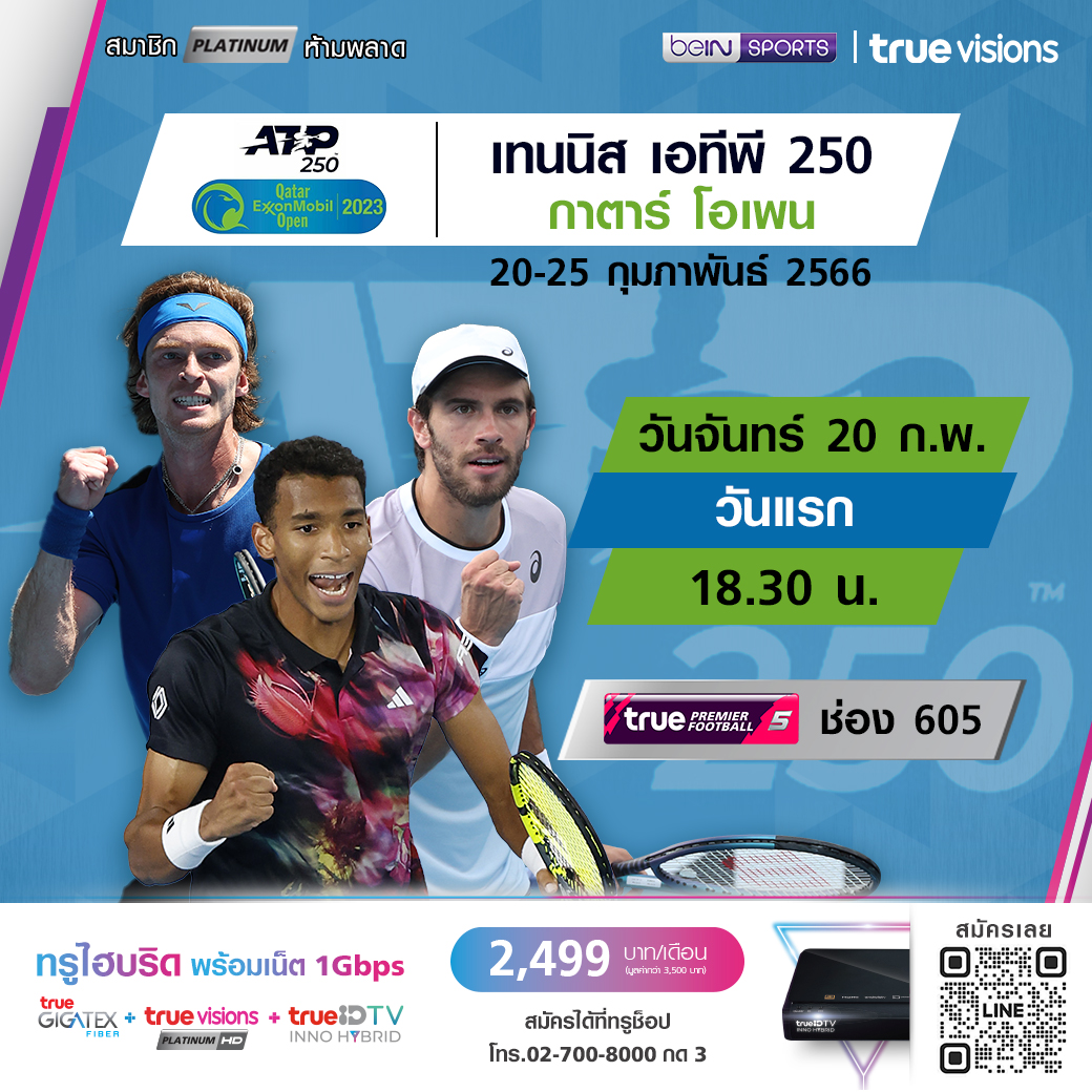 ตะวันออกกลางยังมีความคึกคักของกีฬาเทนนิสต่อเนื่อง สัปดาห์นี้ เอทีพี 250 ซีรี่ส์ เป็นโปรแกรมสำคัญของ กาตาร์ โอเพ่น ที่นักเทนนิสระดับท็อปๆ ของทัวร์นัดมาเจอกัน เพื่อพิสูจน์ความยอดเยี่ยมและแย่งตำแหน่งแชมป์ที่มีเพียงหนึ่งเดียว ชมสดทุกรอบ จากกรุงโดฮา ประเทศกาตาร์ ชมสด ทาง ทรูวิชั่นส์ ที่เดียว