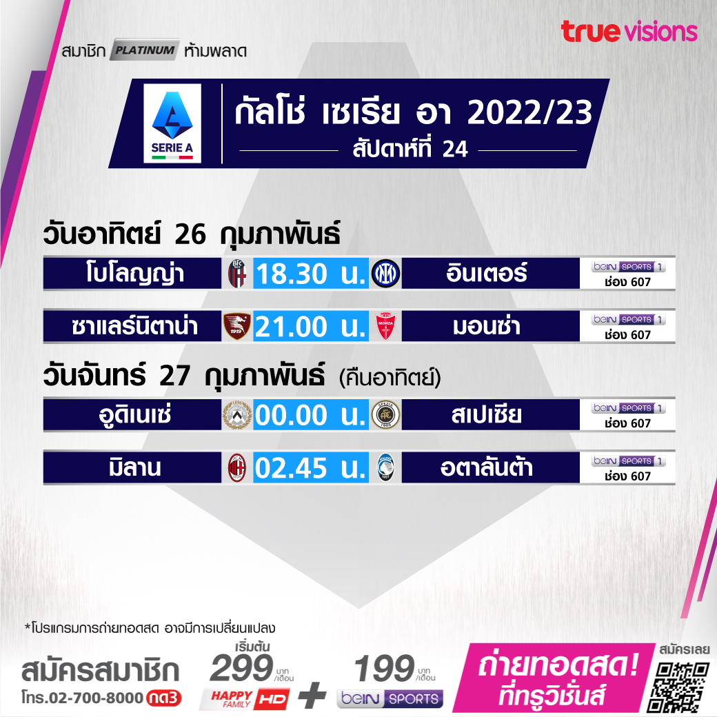 Bologna vs Inter เวลา 18.30-20.30 ทางช่อง beIN 1 (607)