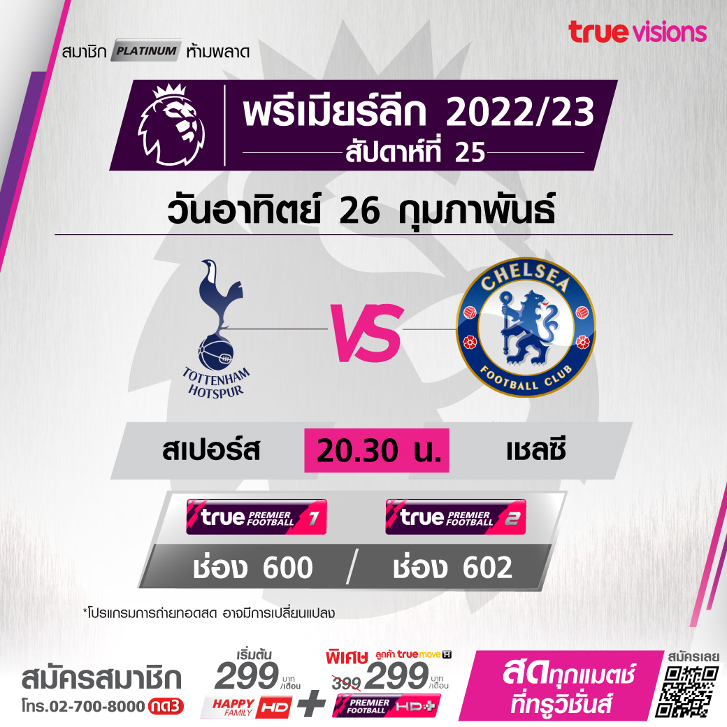 Tottenham Hotspur vs Chelsea เวลา 20:30 - 22:30 ทางช่อง TPF 1 (600) / TPF 2 (602)