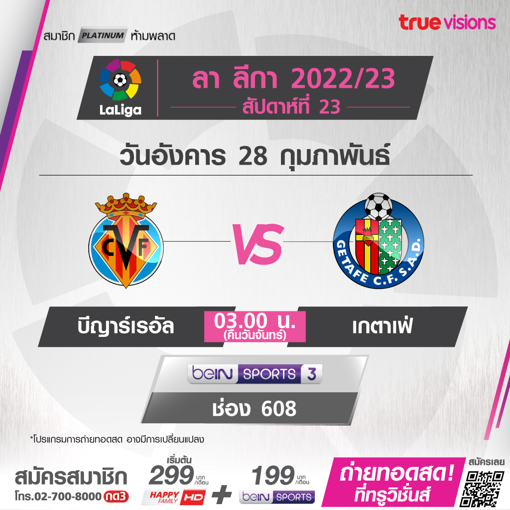 Villarreal vs Getafe เวลา 03.00-05.00 ทางช่อง beIN 3 (608)