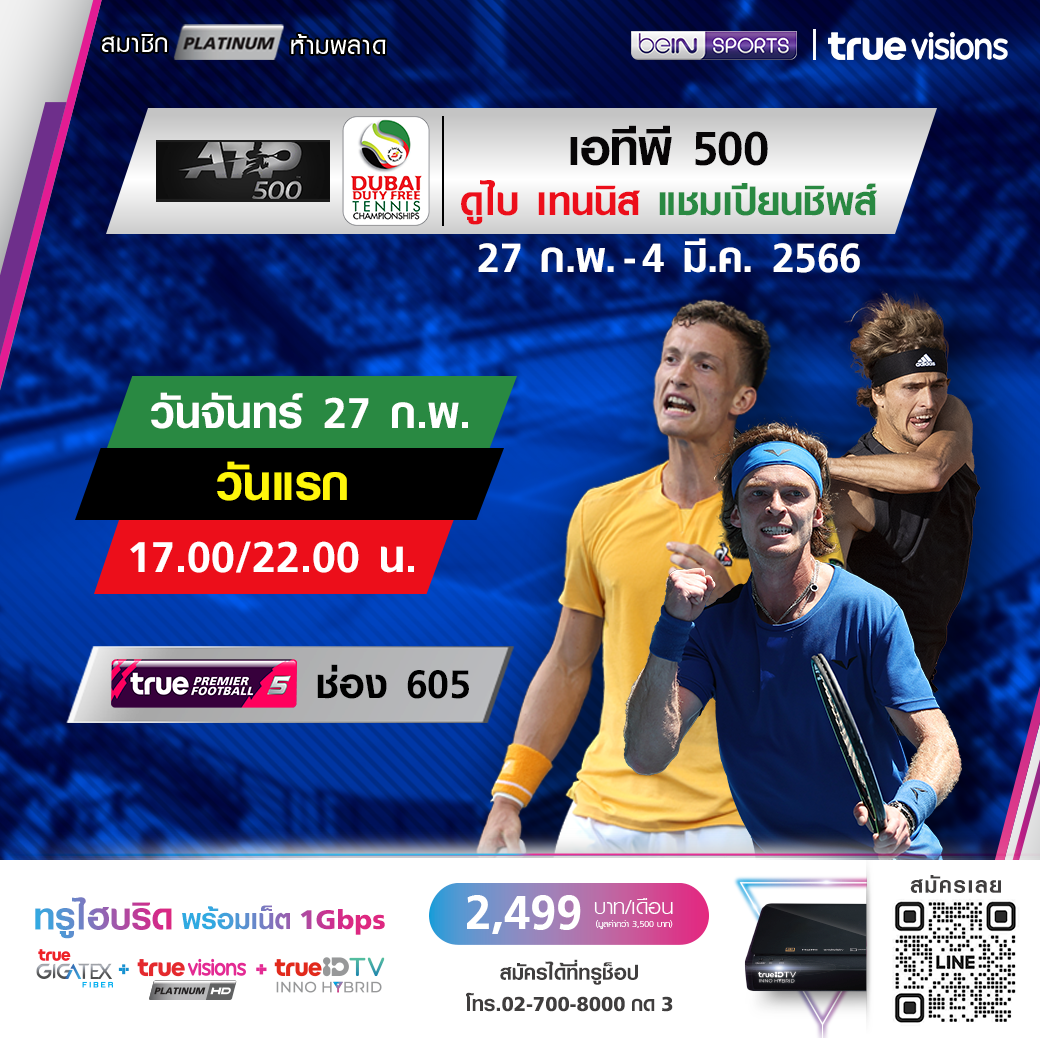 ดุเดือด เร้าใจ ทุกสัปดาห์ กับเทนนิสชายระดับโลกจาก เอทีพี ทัวร์ โดยสัปดาห์นี้มากันที่ตะวันออกกลาง กับรายการระดับ เวิลด์ ทัวร์ 500 ซีรีส์ รายการ ดูไบ เทนนิส แชมเปี้ยนชิพส์ 2023 มือดีของทัวร์ต่างไปรวมตัวกันเพื่้อลุ้นคว้าแชมป์ ชมสดทุกรอบ ชมสด ทาง ทรูวิชั่นส์