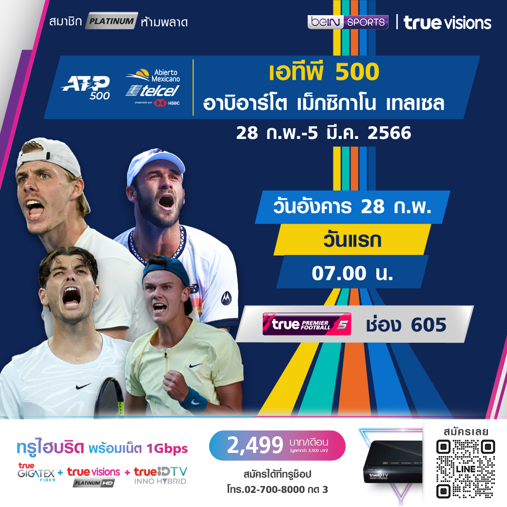 วันนี้มีอะไรดูที่ ทรูวิชั่นส์ ประจำวันจันทร์ที่ 27 กุมภาพันธ์ 66 ยังคงมีศึกเทนนิส เอทีพี ทัวร์ สองรายการอย่าง อบีเอร์โต้ เม็กซิกาโน่ เทลเซล และ ดูไบ เทนนิส แชมเปี้ยนชิพส์ ให้ได้ตามเชียร์กันอย่างต่อเนื่อง คอเทนนิสห้ามพลาด งานนี้ ทรูวิชั่นส์ จัดเต็มให้ชมกันถึงบ้าน