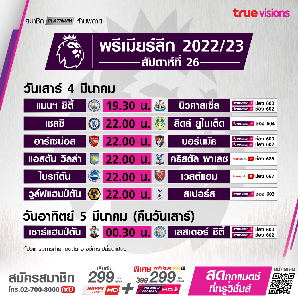 วันนี้มีอะไรดูที่ ทรูวิชั่นส์ ประจำวันเสาร์ที่ 4 มีนาคม 66 ในส่วนของฟุตบอลยังมีศึกพรีเมียร์ลีก อังกฤษ, กัลโช่ เซเรีย อา อิตาลี, ลา ลีกา สเปน และ ลีก เอิง ฝรั่งเศส ให้ได้ตามเชียร์กันอย่างต่อเนื่อง ขณะที่คอมอเตอร์สปอร์ตพลาดไม่ได้กับศึก ฟอร์มูล่า วัน สนามแรกของฤดูกาล 2023 กัล์ฟ แอร์ บาห์เรน กรังด์ปรีซ์ ส่วนกีฬาอื่นๆ ยังมีศึกกอล์ฟ พีจีเอ ทัวร์ รายการ อาร์โนลด์ พาลเมอร์ อินวิเตชั่นแนล, เอเชียน ทัวร์ รายการ นิวซีแลนด์ โอเพ่น, แอลพีจีเอ ทัวร์ รายการ เอชเอสบีซี วีเมนส์ เวิลด์ แชมเปี้ยนชิพ, ศึกเทนนิส เอทีพี ทัวร์ ะ ดูไบ เทนนิส แชมเปี้ยนชิพส์, ดับเบิ้ลยูทีเอ ทัวร์ รายการ มอนเทอร์เรย์ โอเพ่น, ศึกยูเอฟซี 285 และศึกบาสเกตบอล เอ็นบีเอ งานนี้ ทรูวิชั่นส์ จัดเต็มให้ชมกันถึงบ้าน