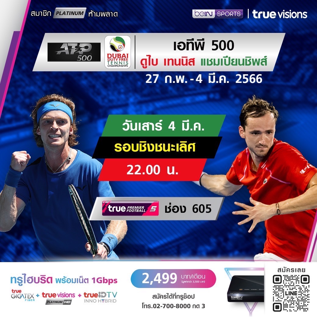 เทนนิส เอทีพี เวิลด์ ทัวร์ 500 ซีรีส์ รายการ ดูไบ เทนนิส แชมเปี้ยนชิพส์ 2023 ในรอบชิงชนะเลิศ ร่วมเชียร์นักเทนนิสระดับโลก ใครจะคว้าแชมป์ไปครอง ชมสด ทาง ทรูวิชั่นส์รอบชิงชนะเลิศ เวลา 22.00 ทางช่อง TPF 5 (605)