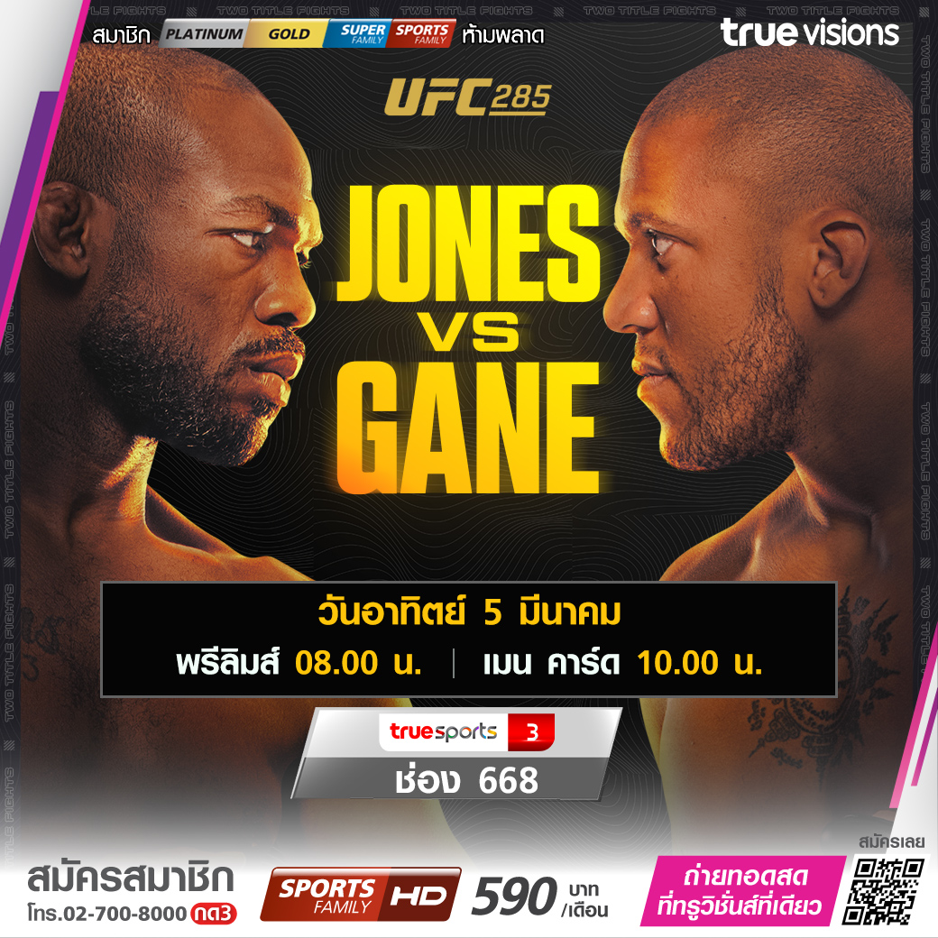 สิ้นสุดการรอคอยสำหรับแฟนๆ ของสุดยอดนักสู้ยูเอฟซีผู้ไร้เทียมทาน จอน โจนส์ อดีตแชมป์ไลท์เฮฟวี่เวตชาวอเมริกัน ที่คัมแบ็กมาลุ้นแชมป์รุ่นเฮฟวี่เวตกับ ซีริล กอน นักสู้พันธ์ดุจากฝรั่งเศส ในศึกยูเอฟซี 285 ชมสด จุใจ จาก ที โมบาย อารีน่า ลาส เวกัส ทั้งช่วงพรีลิมส์ และ เมน คาร์ด ชมสด ทาง ทรูวิชั่นส์ ที่เดียว