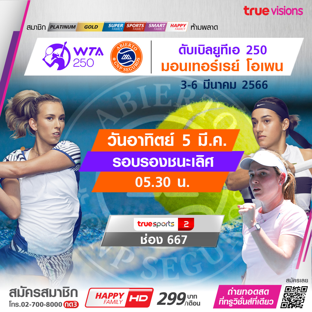 เทนนิสหญิง ดับเบิลยูทีเอ ทัวร์ ที่มอนเทอเรย์ ประเทศเม็กซิโก กับรายการระดับเวิลด์ ทัวร์ 250 ซีรีส์ อบีเอร์โต้ จีเอ็นจี เซกูรอส ในรอบรองชนะเลิศ ร่วมลุ้นกันว่าใครจะก้าวไปเป็นแชมป์ในรายการนี้ ชมสด ทาง ทรูวิชั่นส์ ที่เดียววันอาทิตย์ 5 มี.ค. รอบรองชนะเลิศ เวลา 05.30 ทางช่อง TS 2 (667)