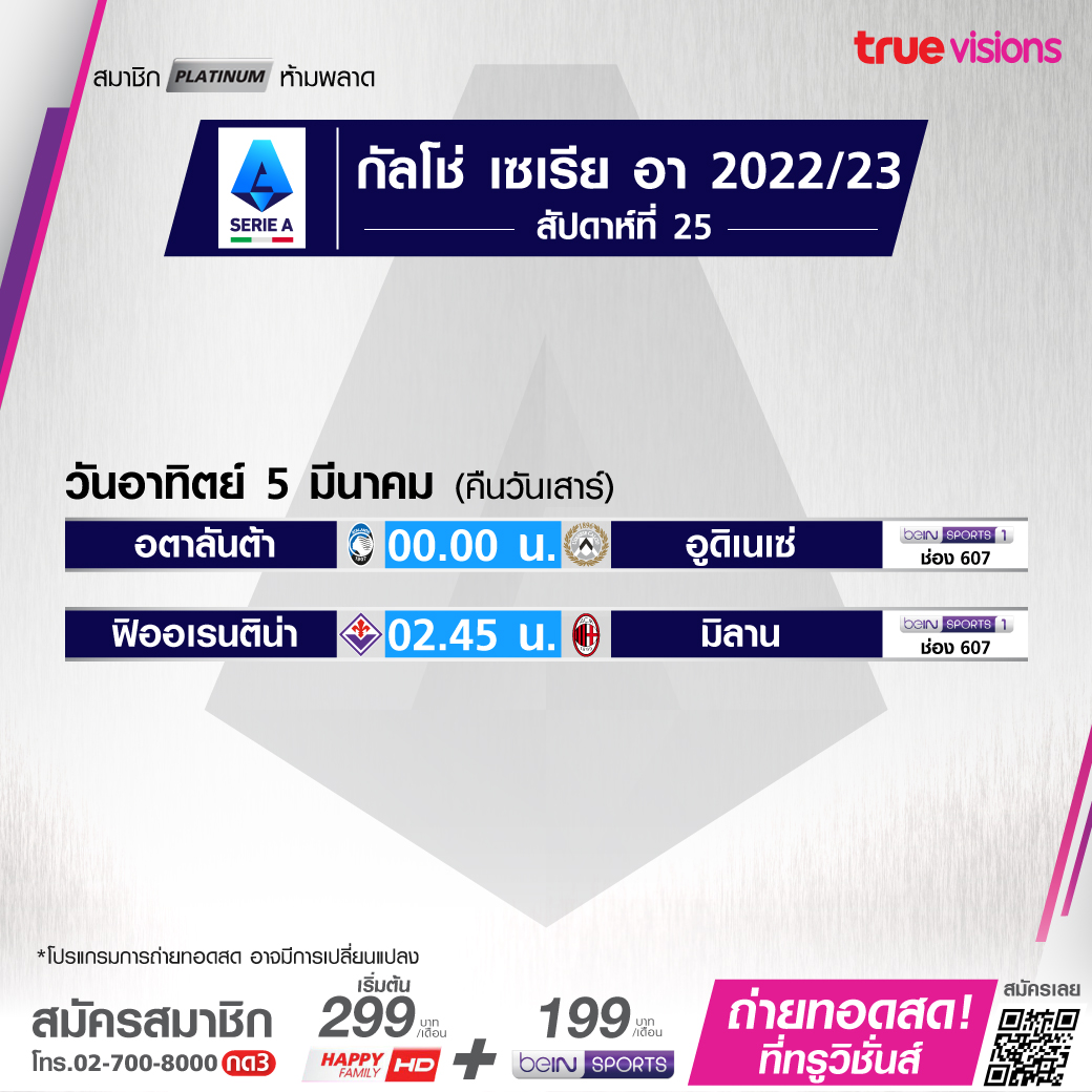 Atalanta vs Udinese เวลา 00.00-02.00 ทางช่อง beIN 1 (607)