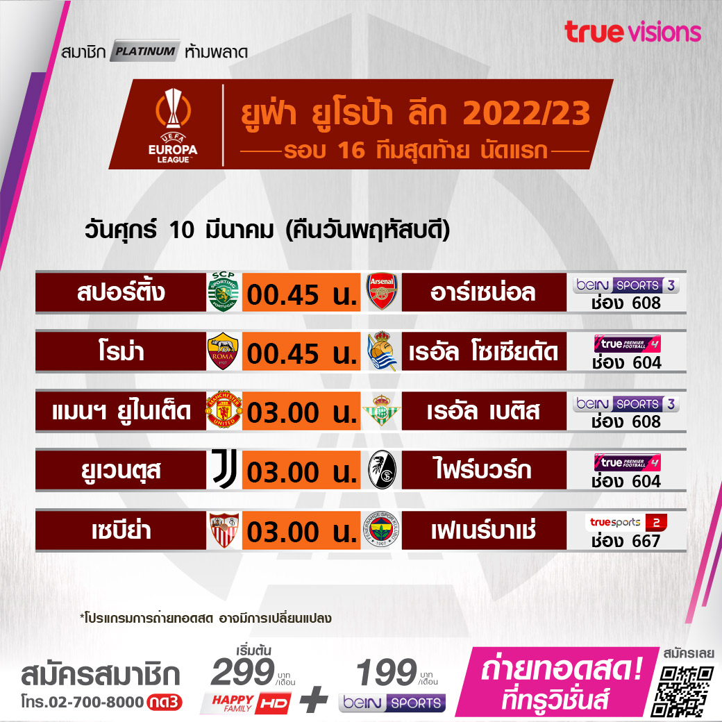 วันนี้มีอะไรดูที่ ทรูวิชั่นส์ ประจำวันพฤหัสบดีที่ 9 มีนาคม 66 ในส่วนของฟุตบอลยังมีศึกยูฟ่า ยูโรป้า ลีก รอบ 16 ทีมสุดท้ายนัดแรก, ยูฟ่า ยูโรป้า คอนเฟอเรนซ์ ลีก รวมถึงฟุตบอลซาอุดิโปรลีก ห้ได้ตามเชียร์กันอย่างต่อเนื่อง ขณะที่กีฬาอื่นๆ ยังมี สนุกเกอร์ ศึก ซิกส์ เร้ด เวิลด์ แชมเปี้ยนชิพ 2023, เทนนิส เอทีพี ทัวร์ และ ดับเบิ้ลยูทีเอ ทัวร์ 1000 รายการ บีเอ็นพี พาริบาส์ โอเพ่น, กอล์ฟพีจีเอ ทัวร์ รายการ เดอะ เพลเยอร์ส แชมเปี้ยนชิพ, กอล์ฟ เอเชี่ยนทัวร์ อินเตอร์เนชั่นแนล ซีรี่ส์ ไทยแลนด์ รวมถึงศึกบาสเกตบอล เอ็นบีเอ งานนี้ ทรูวิชั่นส์ จัดเต็มให้ชมกันถึงบ้าน