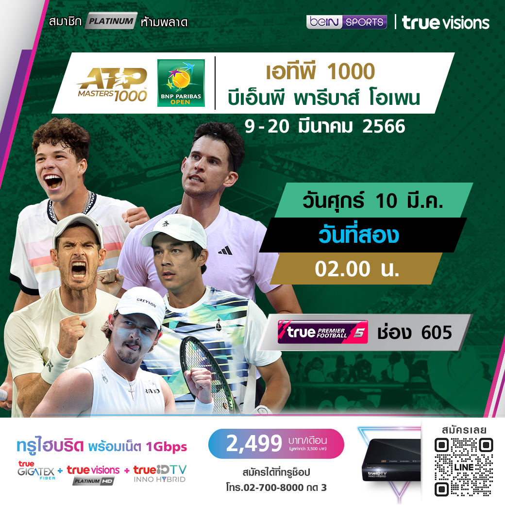 วันศุกร์ 10 มี.ค. วันแรก เวลา 02.00 / 09.00 ทางช่อง True Tennis (670)