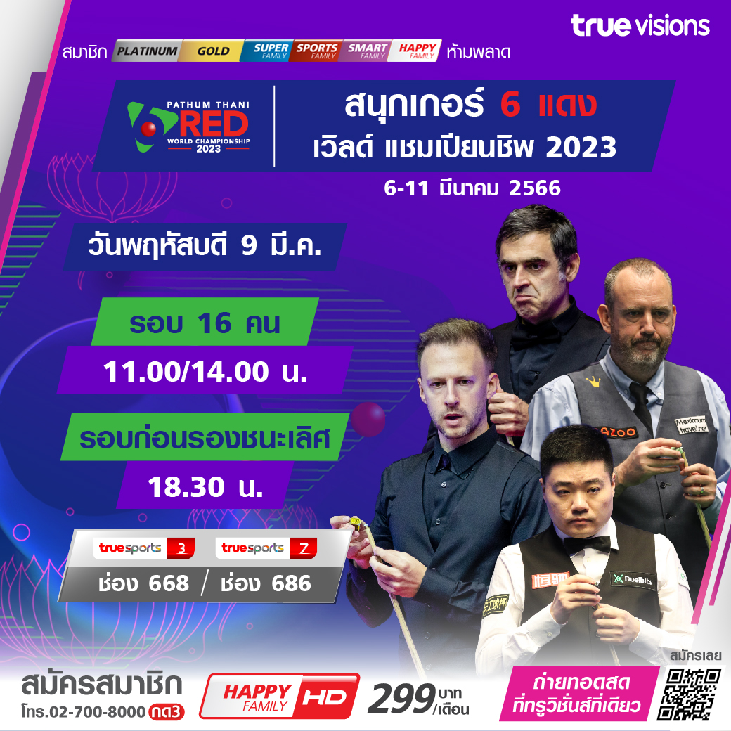 ศึกสอยคิวระดับโลก ซิกส์ เร้ด เวิลด์ แชมเปี้ยนชิพ 2023 มาถึงในรอบ 16 คนสุดท้าย และต่อด้วยรอบรองชนะเลิศ เชียร์นักสนุกเกอร์ไทยปะทะนักสนุกเกอร์ระดับโลกชมสด ทุกรอบ จุใจ ชมสด ทาง ทรูวิชั่นส์ ที่เดียวรอบ 16 คนสุดท้าย เวลา 11.00 / 14.00