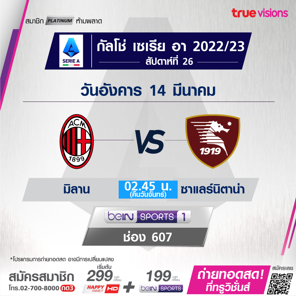 Milan vs Salernitana เวลา 02.45-04.45 ทางช่อง beIN 1 (607)