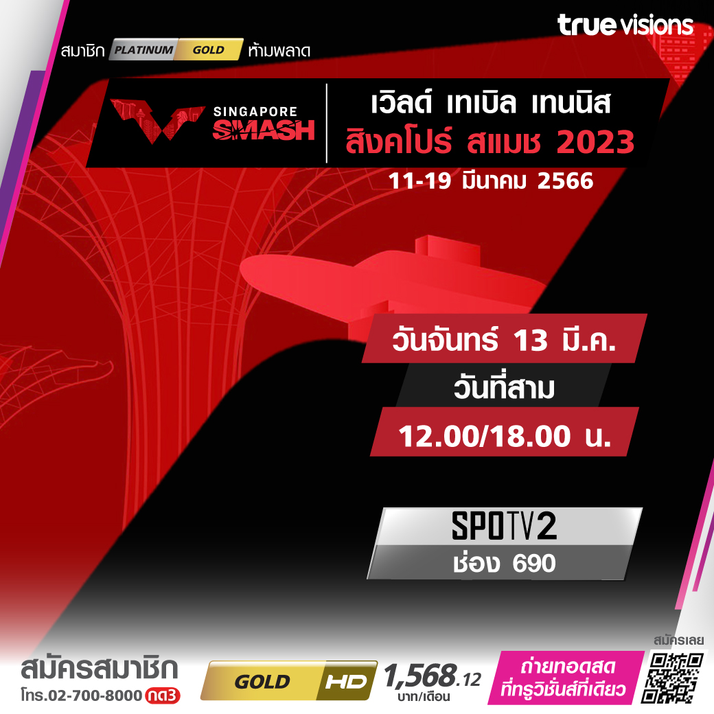 พลาดไม่ได้จริงๆ สำหรับศึก เวิลด์ เทเบิล เทนนิส สิงคโปร์ สแมช 2023 ที่รวบรวมนักกีฬามือระดับโลกของวงการมาพิสูจน์ฝีมือกัน ชมสดจุใจ ครบทุกรอบ ทั้งคู่และเดี่ยว ชมสด ทาง ทรูวิชั่นส์ ที่เดียว