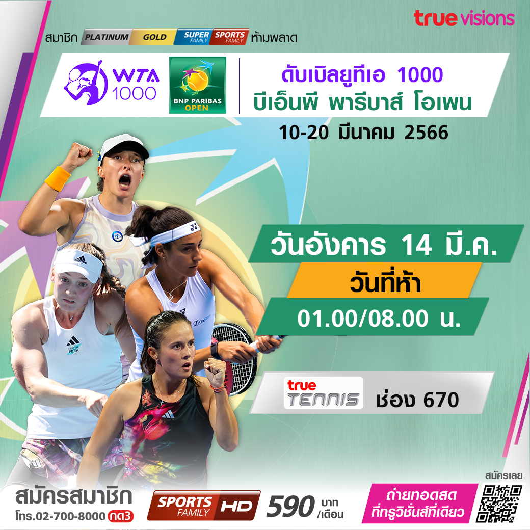 เทนนิสหญิง ดับเบิลยูทีเอ ทัวร์ 1000 ซีรีส์ รายการ บีเอ็นพี พารีบาส์ โอเพ่น ทัวร์นาเมนต์ยิ่งใหญ่ระดับน้องๆ แกรนด์สแลม นักหวดหญิงมือระดับท็อปของโลกลงสนามเพื่อชัยชนะและเดินหน้าสู่ตำแหน่งแชมป์ ชมสด ครบทุกรอบ จากอินเดียนเวลส์ ชมสด ทาง ทรูวิชั่นส์ ที่เดียว
