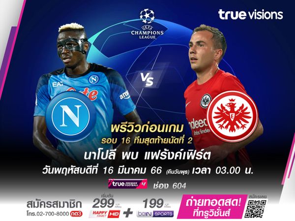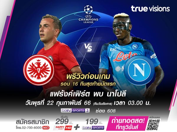 ศึกยูฟ่า แชมเปี้ยนส์ ลีก รอบ 16 ทีมสุดท้ายนัดที่สอง นาโปลี จากอิตาลี จะรับการมาเยือนของ ไอน์ทรัค แฟร้งค์เฟิร์ต จากเยอรมนี โดยเกมนี้ นาโปลี เจ้าถิ่น อยู่ในสถานการณ์ที่ดีกว่ามาก หลังบุกไปชนะมาได้ก่อน 2-0 ในเกมแรก แถมฟอร์มการเล่นของ นาโปลี ในช่วงที่ผ่านมาก็ยอดเยี่ยมมากๆ หลังชนะได้ถึง 8 จาก 9 เกมหลังสุดรวมทุกรายการ ขณะที่ แฟร้งค์เฟิร์ต ฟอร์มค่อนข้างแย่ในช่วงที่ผ่านมา หลังชนะได้แค่เกมเดียวจาก 6 เกมหลังสุดรวมทุกรายการ แถมยังไม่ชนะใครมา 4 เกมติดต่อกันเข้าไปแล้ว