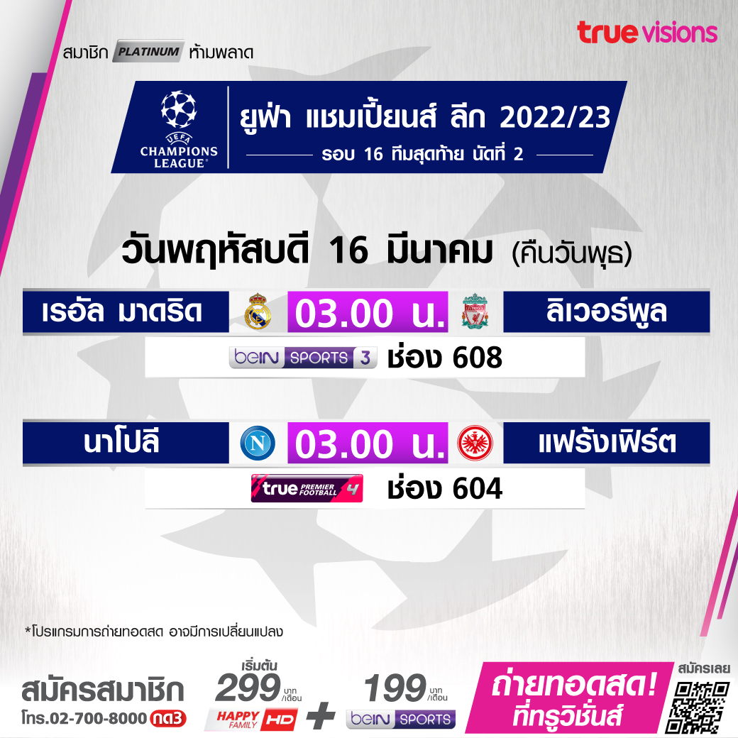 วันนี้มีอะไรดูที่ ทรูวิชั่นส์ ประจำวันพุธที่ 15 มีนาคม 66 ในส่วนของฟุตบอลยังมีศึกยูฟ่า แชมเปี้ยนส์ ลีก รอบ 16 ทีมสุดท้ายนัดที่สอง, พรีเมียร์ลีก อังกฤษ และ ยูฟ่า ยูโรป้า คอนเฟอเรนซ์ ลีก ให้ได้ตามเชียร์กันอย่างต่อเนื่อง ขณะที่กีฬาอื่นๆ ยังมีศึกเทนนิส เอทีพี ทัวร์ และ ดับเบิ้ลยูทีเอ ทัวร์ 1000 รายการ บีเอ็นพี พาริบาส์ โอเพ่น, แบดมินตันรายการสำคัญอย่าง ออล อิงแลนด์ โอเพ่น, ศึก เวิลด์ เทเบิล เทนนิส สิงคโปร์ สแมช และศึกบาสเกตบอล เอ็นบีเอ งานนี้ ทรูวิชั่นส์ จัดเต็มให้ชมกันถึงบ้าน