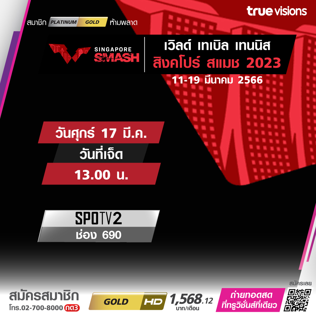 ศึก เวิลด์ เทเบิล เทนนิส สิงคโปร์ สแมช 2023 ที่รวบรวมนักกีฬามือระดับโลกของวงการมาพิสูจน์ฝีมือกัน ชมสดจุใจ ครบทุกรอบ ทั้งคู่และเดี่ยว ชมสด ทาง ทรูวิชั่นส์ ที่เดียว