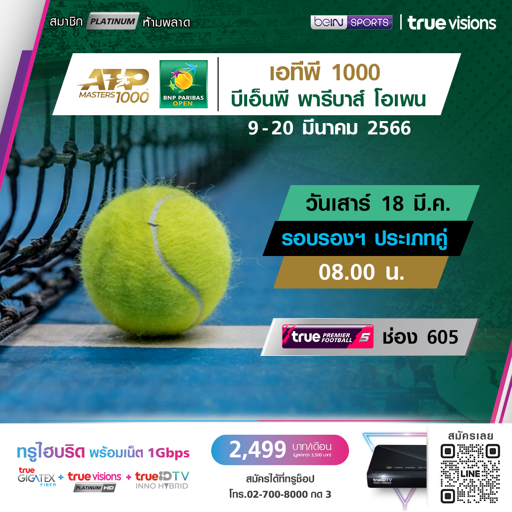 วันเสาร์ 18 มี.ค. รอบรองชนะเลิศ เวลา 05.00 / 08.00 ทางช่อง True Tennis (670)