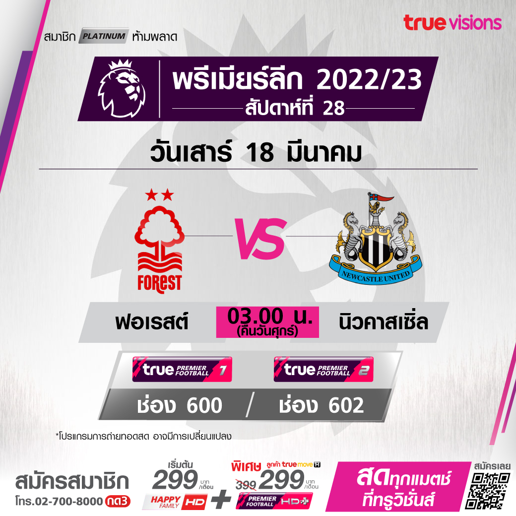 Nottingham Forest vs Newcastle เวลา 03:00 - 05:00 ทางช่อง TPF 1 (600) / TPF 2 (602)