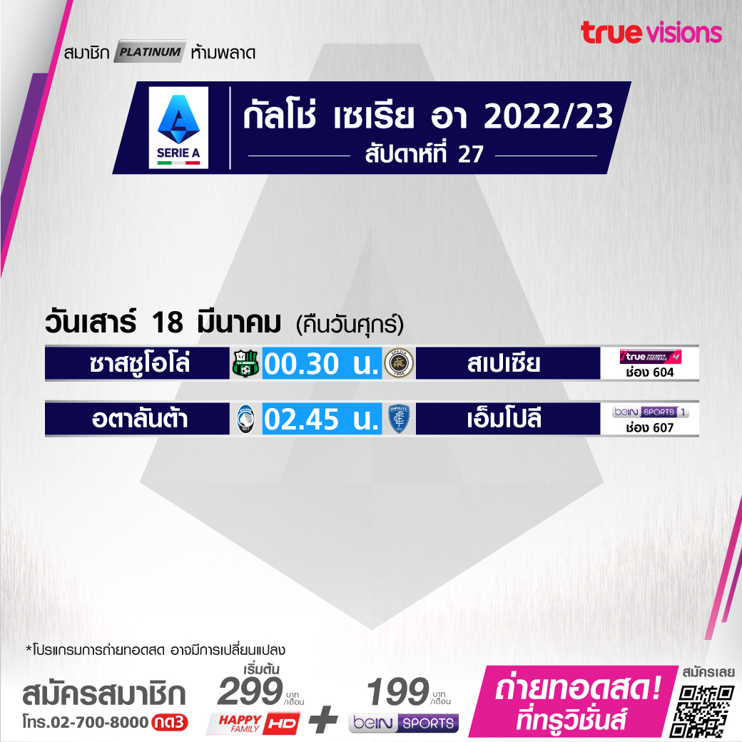 Atalanta vs Empoli เวลา 02.45-04.45 ทางช่อง beIN 1 (607)